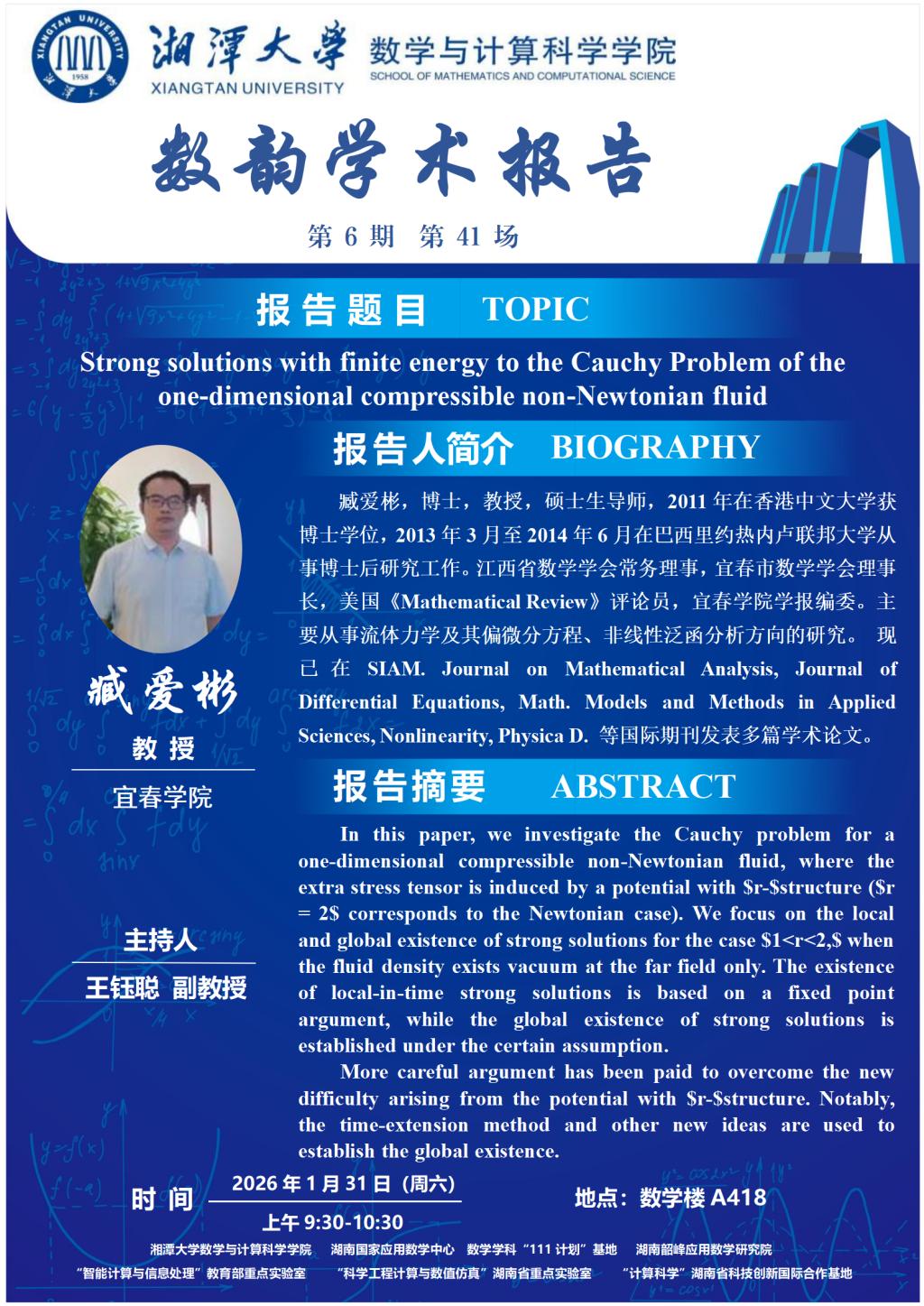 数韵学术报告-臧爱彬-Strong solutions with finite energy to the Cauchy Problem of the one-dimensional compressible non-Newtonian fluid